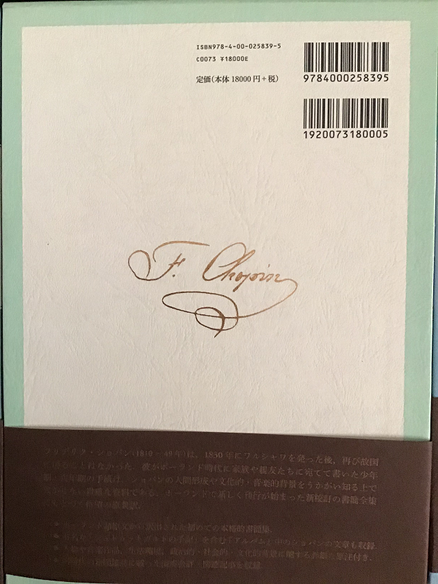 それでも新刊本は知らない人も多いと思うのでこの機会に紹介しておきます。 ショパンが生前に友人や知人とやりとりしたお手紙はポーランドの国宝でもあり世界の人にとって宝でもあります。 ショパン自身は生前にそれらの私物は焼却して欲しいと言い残していましたが、遺族はショパンが生前に残していたものはひとつも失いたくないとそれらを焼却しませんでした。 それはショパンにとっては遺憾かもしれませんが、その後のショパン研究の貴重な財産となりました。 それらの書簡集は近年書簡集としてまとめられて出版されたのですが、その邦訳が岩波書店から今年発行されました。 予約していたのも届いたので、ここで写真の載せます。 ハードカバーで結構分厚いので気軽にバックに入れて外出先で読むものではないので、まだ読んでないけどね(´∀` ) 前から読みたいなと思っていたのは、初めてショパンの前奏曲の全曲(Op. 28)の第23番を聞いたときに、まるでスカルラッティの曲のように聞こえたので、ショパンはスカルラッティが好きだったのかなと思って検索したら、出典は不明だけど聴衆の理解があれば全曲スカルラッティの公開演奏会を開いてもいいと知人に漏らしていたらしいことから、第23番はスカルラッティへのオマージュだと確信しているのですが、原典はおそらく書簡集だろうと思っても原書も入手困難だし... 初版でハードカバー版なのでお値段が普通の書籍に比べ高いです。 手元にある3巻は、 ・ポーランド時代 1816〜1831 18,000円 ・パリ時代(上) 1831〜1835 20,000円 ・パリ時代(下) 1936〜1839 20,000円 でそれぞれ時代によって異なる彩色のカバーになっています。 外観だけ写真で紹介するね(´∀` ) ![]() ![]() それぞれはハードカバーに入っているので写真で紹介。 ![]() ![]() ![]() ![]() ![]() ![]() 興味深い内容があったら別途お便りするね。 んじゃまた。 |