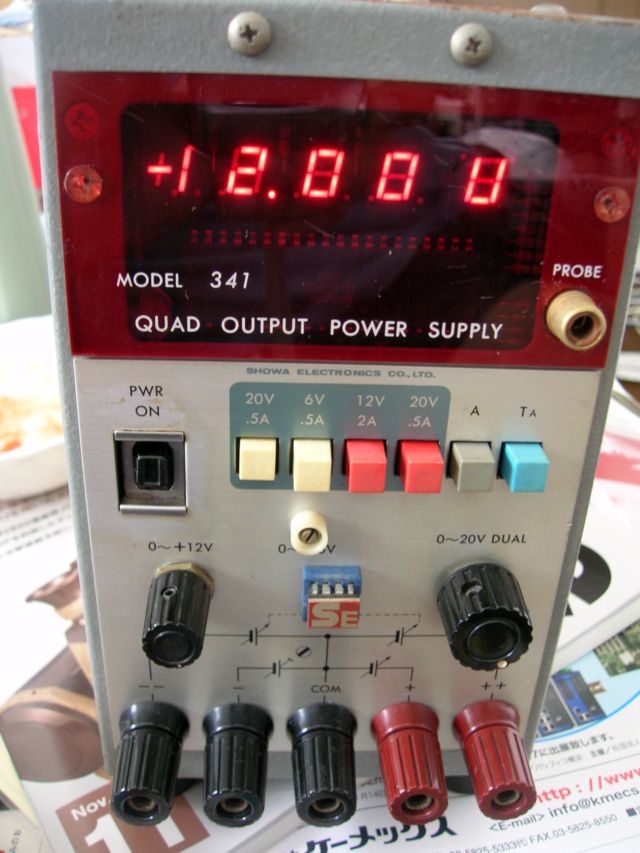 欲しいと思ったのはHP4951AのレストアでDC電源を外部から供給して動作させようとしたときに正負の12Vと+5Vが同時に必要だったのが最初だった。 今まで持っている単出力電源を2つパラに動かして、単出力では-12vを3出力で+12Vと+5Vを供給するという苦肉の策を講じるしかなかった。 世の中に正負電源を同時に設定できるデュアルトラッキング電源があると知ってからは欲しくなった。しかしアナログ回路とかでは当たり前な正負電源を作るにはデュアルトラッキング電源は必需品らしく人気が高くすぐ高値が付いてしまう。 たまたま古いせいか入札がまったくされずに回転寿司状態のデュアルトラッキング電源が出品されているのを発見。誰も入札する気配はなく落札してしまったのがこれ。 ![]() 昭和エレクトロニクスという聞き慣れない会社の製品。かなり古いらしいが動作には問題が無い。正面に会社のロゴの付いた8pin DIPのICが差し込んである。これはロゴなのか機能部品なのかどっちなんだろう。たぶんロゴなんだろうと思うけど。怖くて抜けない。電源スイッチが部品が取れてしまったのかわかり辛い。 よくよく見るとこれはCVCC電源ではなかった。CV(定電圧)だけである。まあそれでも十分である。人気のあるのは電流制限のかけられるCVCCなわけで。 使ってみると電圧電流はディジタル表示なので見やすい。正負アナログ電源とディジタル用電源にバイアス用かECL用の負電源と全部で4出力。謎のプローブ端子とTaという温度表示ボタンがある。もしかして温度センサーのプローブをつなぐと素子の温度とかを測定できるとかいう機能だろうか。おもしろい機能である。使わないけど。 昭和エレクトロニクスはプリント基板設計試作の大手キョウデンの系列だったキョウデンエレクトロニクスの前身の会社であった。名前からして電子機器の設計製造を得意としていたと思われるが後に会社精算している。 測定器にもいろいろ歴史が隠されている。 |