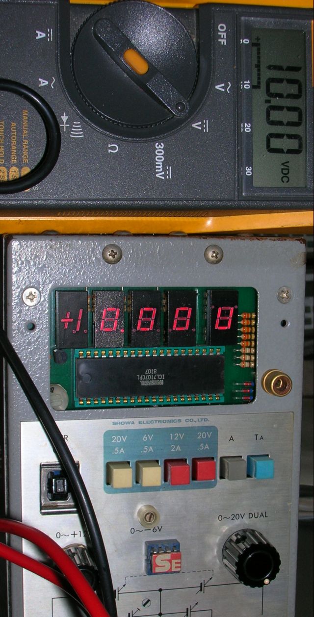 この昭和エレクトロニクスの電源、結構安定度とトラッキング精度は抜群に良いことが判明。セトリングタイムも短く、30分もしないううちに手持ちのHP3456Aでは変動が測定確度範囲内に収まってしまったように見える。 ![]() デュアルトラッキング電源は正負の電圧が対称的になるように制御されるがその誤差も1mV未満に収まっている。申し分の無い性能だが、一点だけ難点があった。それは内蔵のデジタル電圧計が50mVもずれている点。 ![]() 10mVまでの表示桁があって精度が0.5%というのはおかしいので、たぶん調整がずれているのだろうと思って中を開けてみようかと思ったけど面倒なので諦めかけた。フロントのアクリルパネルがネジ止めしてあるのに気づいて外してみたら、調整用の半固定抵抗器を発見。それを調整して無事調整完了。 ちょっとチェックしたら電圧選択の負電源側が時々正しい電圧を示さない(オープンになっている感じ)なのが発覚。押しボタンスイッチの接触不良だろうか?時々ちゃんと安定した電圧を表示する時があるが、それ意外は0Vとか出力電圧に近い値をフラフラ変動して表示してしまう。実際の出力は正負のオフセットが1mV未満と高精度なので問題無い。 最近手にいれたもうひとつのデュアルトラッキング電源。自作品で、外観を見たとたんにピンと来るものがあって入手を決意。手にしてみると見立て通り、しっかりとした作りである。本職の人が実験用にメーカー品と遜色無い性能のものを設計製作したものらしい。それとなく雰囲気が伝わってくる。 出力の安定度はアナログ電圧計とは不釣り合いなほど高い。1mV単位まで安定している。ほとんど精密直流電源のグレードである。一般の市販の実験用電源は電圧表示器の精度と見合う安定度しか備えていないのが普通であるので、自作でこれだけの安定度は驚きにあたいする。残念ながらトラッキング精度は正負で4mV近いオフセットがある。おそらく調整ずれだと思われる。実用上は全然問題無い精度であるが昭和エレクトロニクスのものと比較すると安定度と同じぐらいのトラッキング精度があっても良いはず。中を開けて調整し直せば良いのかもしれないが、自作でネジがかなりの数使われているのでちょっとカバーを外すのが面倒。いずれまた別の機会に中を拝見しよう。ちょっと電圧設定用のポテンションメーターのつまみが出ているのでちょっとした弾みに手で触れてしまって設定がずれてしまうのが難点。 どちらのデュアルトラッキング電源も定電流動作機能は無し、出力ON/OFF機能も無いが、過電流保護機能はついているのでオペアンプを使用したアナログ回路の実験には十分である。 |